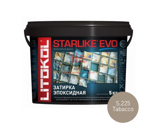 Литокол Старлайк ЭВО S 225 Tabacco 5 кг, двухкомпонентный эпоксидный кислотостойкий, щелочестойкий состав для затирки межплиточных швов с шириной шва от 1 до 15 мм и использования в качестве клея для всех видов облицовочной плитки и мозаики. Компонент А представляет собой смесь эпоксидной смолы, цветных микросфер и специальных органических добавок. Компонент В — инновационный органический катализатор (отвердитель).